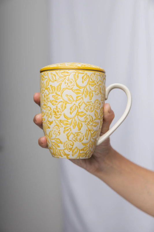 Tranquillo - Yellow Filigree Mug with Strainer and Lid