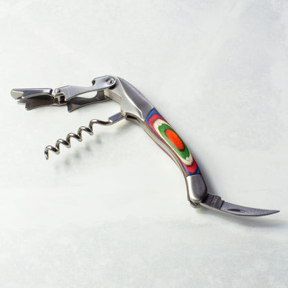 Liven up the party with the Baltique® Marrakesh Collection Waiter’s Friend Corkscrew! Masterfully crafted from layers of colored birch, the corkscrew’s wood handle features a rainbow blend of red, green, orange, blue and natural wood colors. The colorway was inspired by the bright and colorful marketplaces of Morocco. The serrated blade of the stainless steel foil cutter makes quick work of removing foil wrapping from champagne and wine bottles. The stainless steel corkscrew removes corks quickly and cleanly. No more shredded corks! It features a stainless steel bottle opener so you can crack open a beer, soda or mixer.