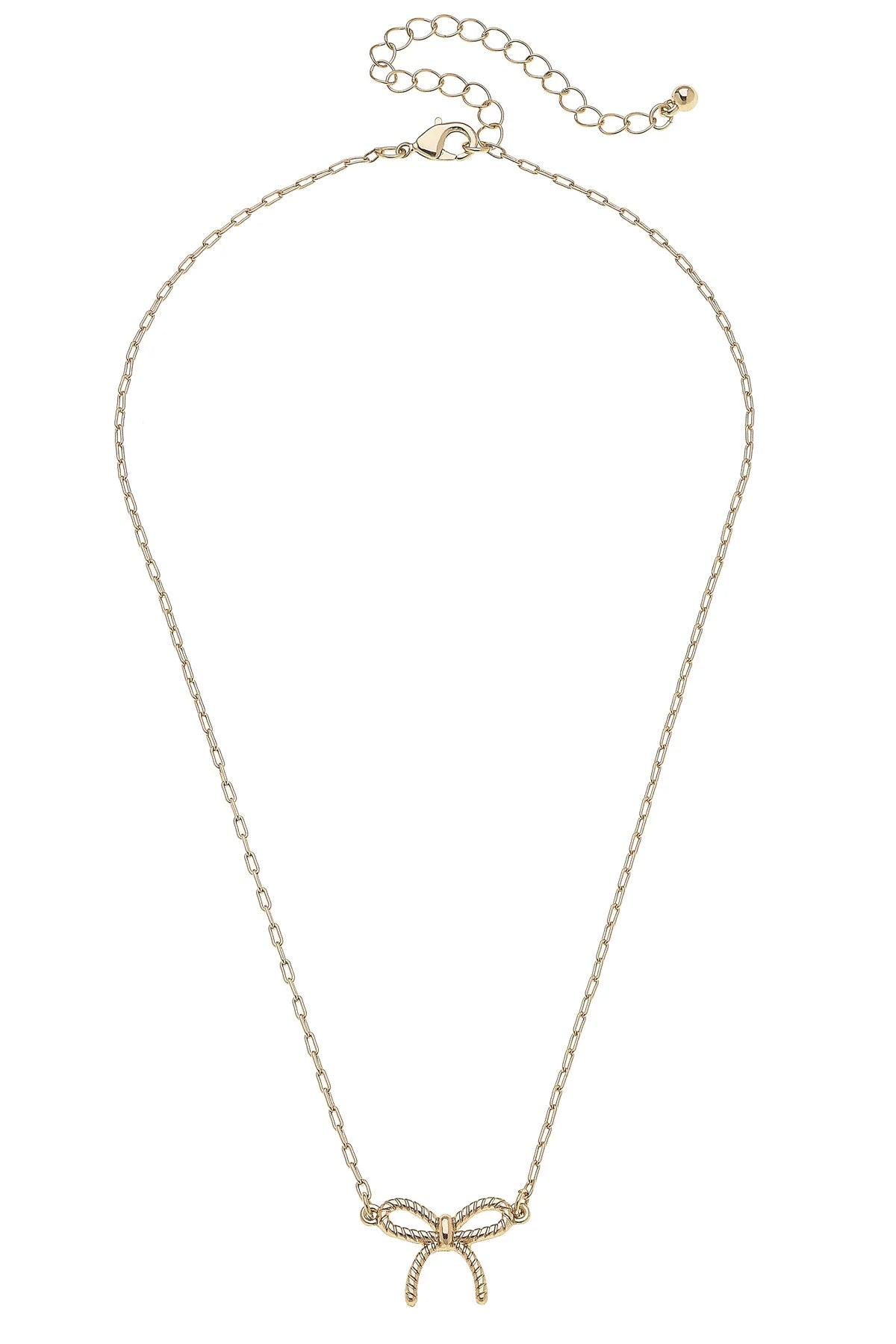 The Bessie Rope Bow Necklace is a delightful statement piece. With its shiny gold rope bow pendant, this necklace is the perfect blend of whimsy and elegance.