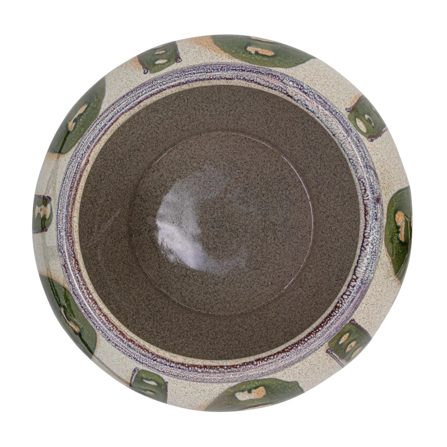 Add charm and personality to any space with this green and cream stoneware planter. The oversized, rounded body has a vibrant green, abstract design on an off-white reactive glaze with a faint lavender rim. The wide opening is perfect for your latest botanical creations or a simple bundle of dried greenery. This gorgeous vessel can also stand alone without filler or can be used as a catch-all in the living room or any room in the home or office.