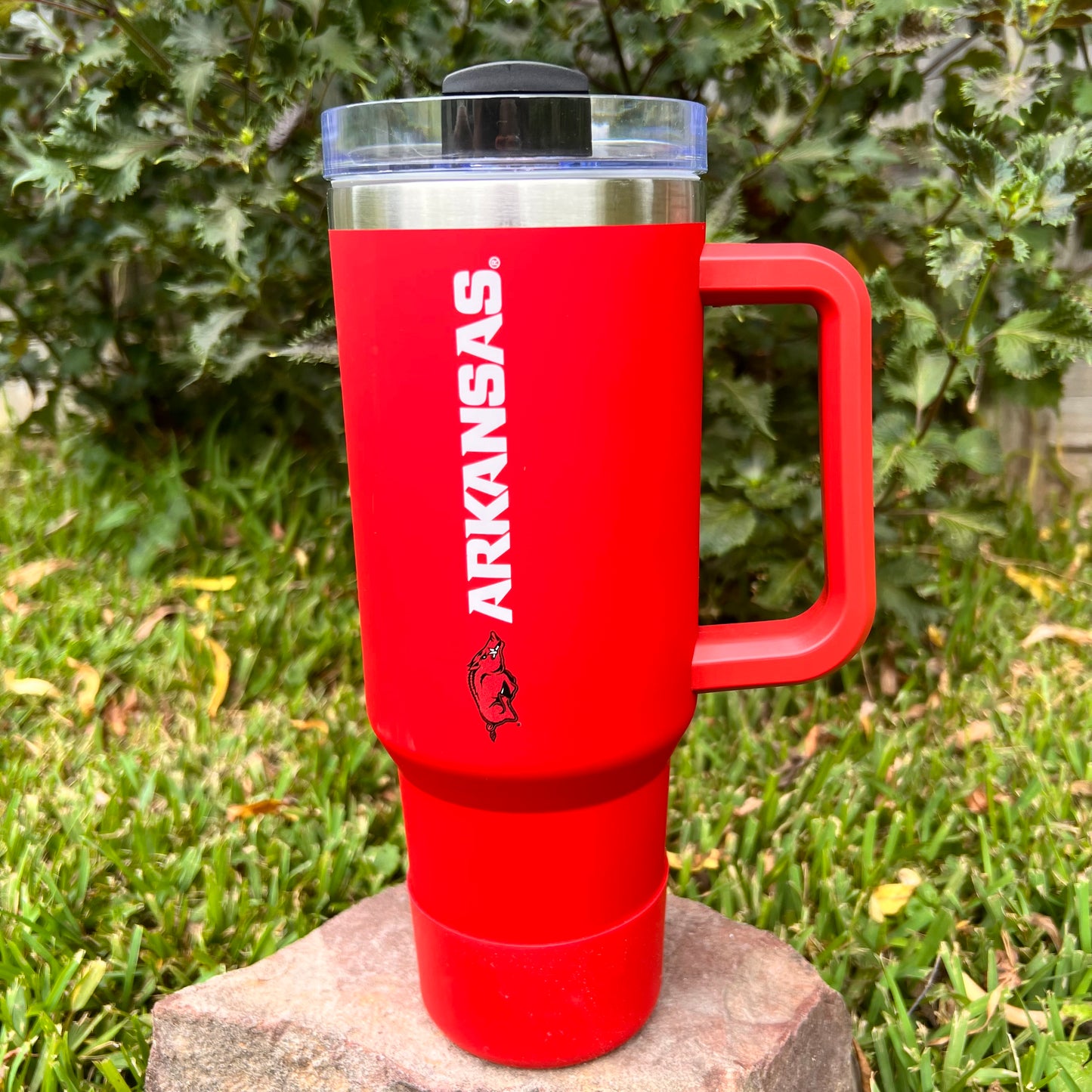 No one will question your Razorback fandom with this awesome addition to your tumbler collection! This stainless steel tumbler with a handle and removable straw has striking graphics on a crisp red background, perfect for game day and everyday hydration.