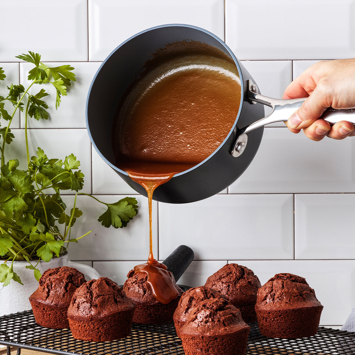 Crafted from hard anodized aluminum for strength and scratch resistance, this 2 quart saucepan is ready to simmer soups and sauces at a moment's notice. And cleanup will be simple thanks to our signature healthy ceramic nonstick.