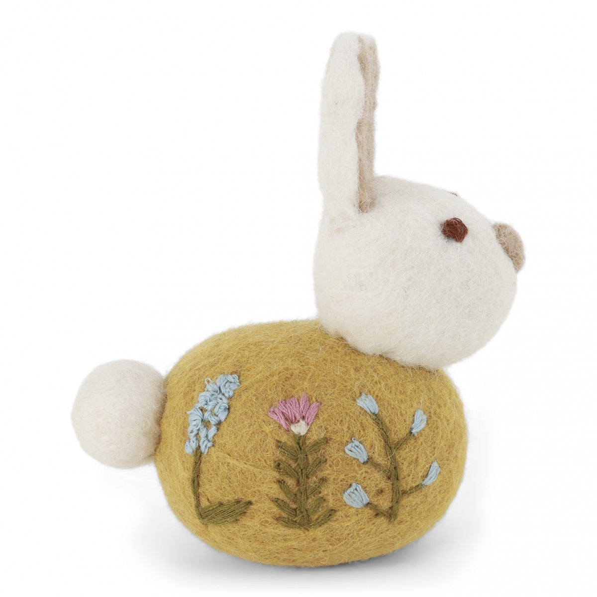 This seated ochre felted bunny with intricate floral embroidery radiates warmth and charm and its handmade design brings a whimsical, cozy feel to any space.