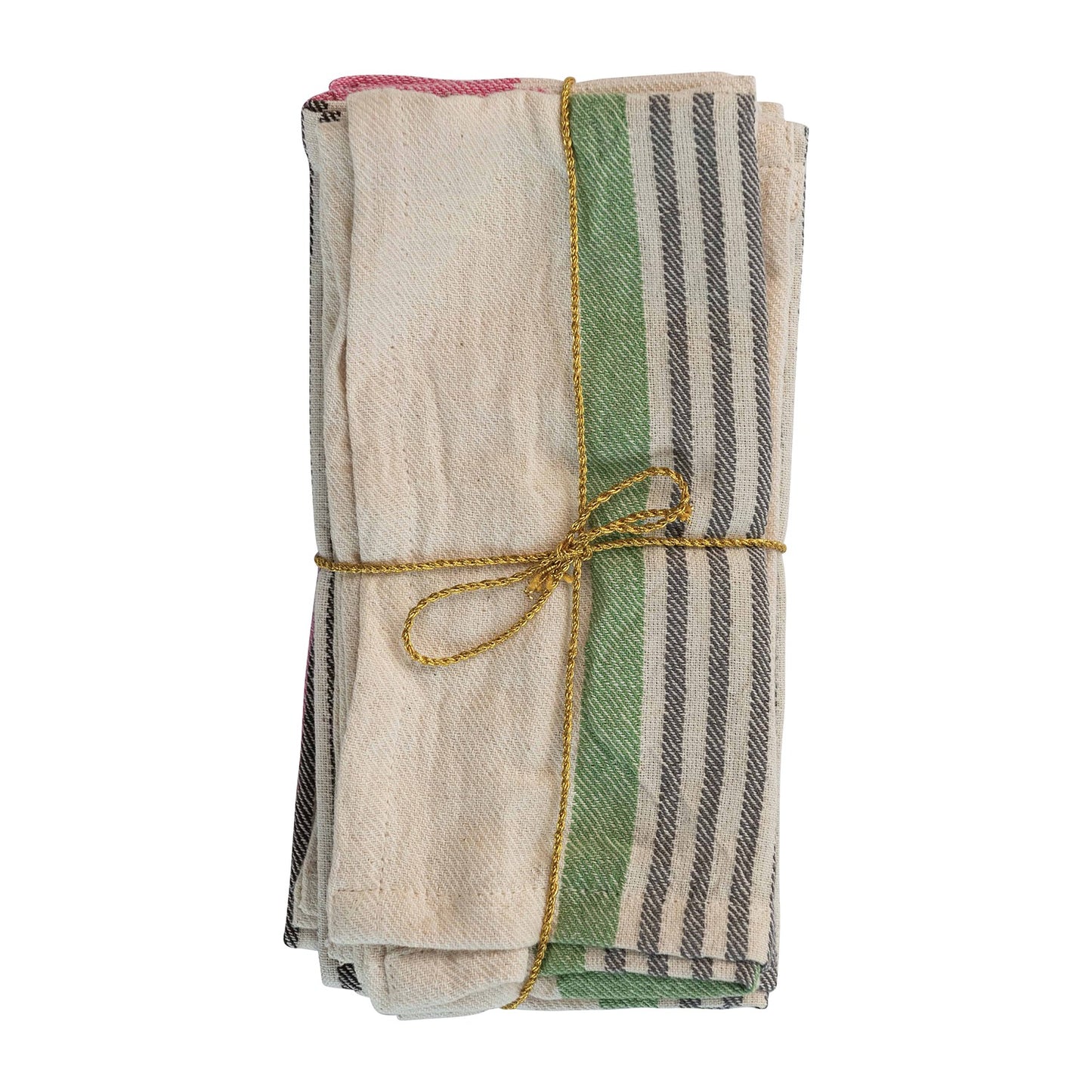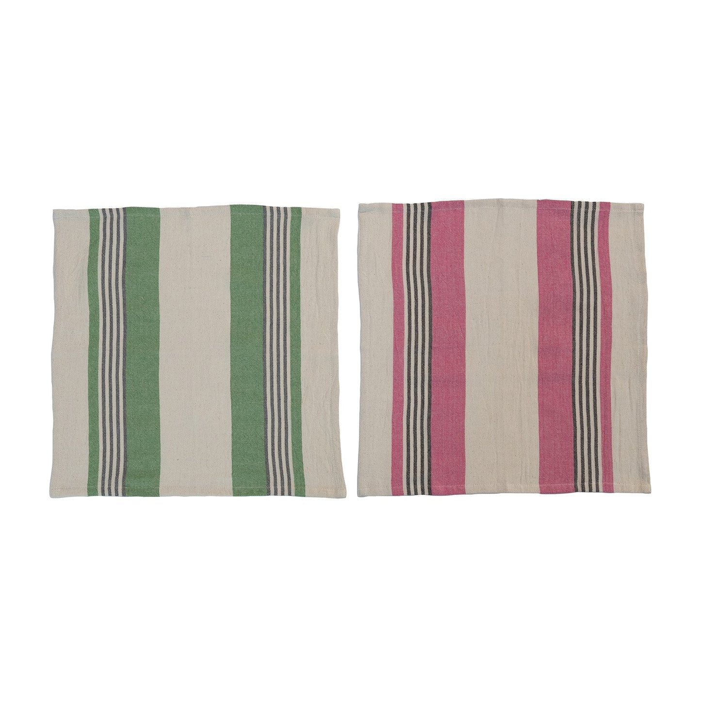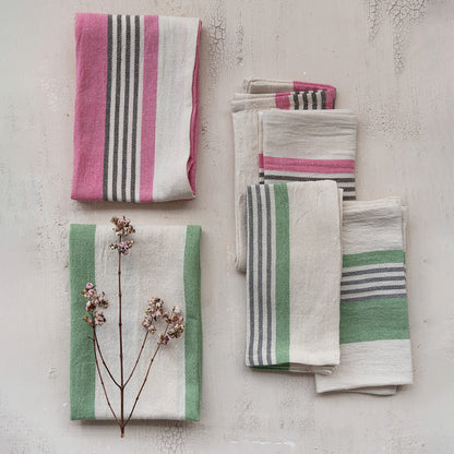 Bring a pop of color to your table with these playful cotton napkins, perfect for everyday use or special occasions. The natural cotton has vibrant stripe of fresh green or bright pink that adds a springtime vibe to any setting.