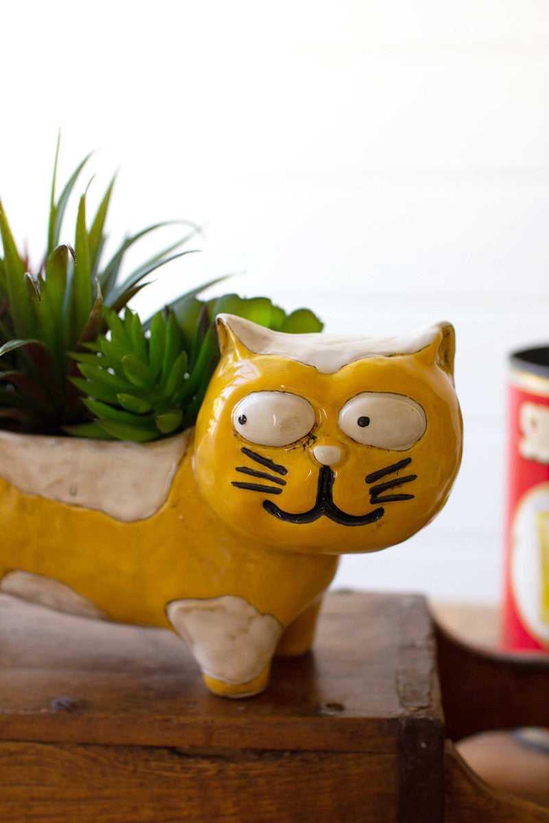 A playful touch for any space whether filled with flowers, succulents, or catnip, this adorable kitty planter as cheery yellow and white glaze and a mischievous smile.