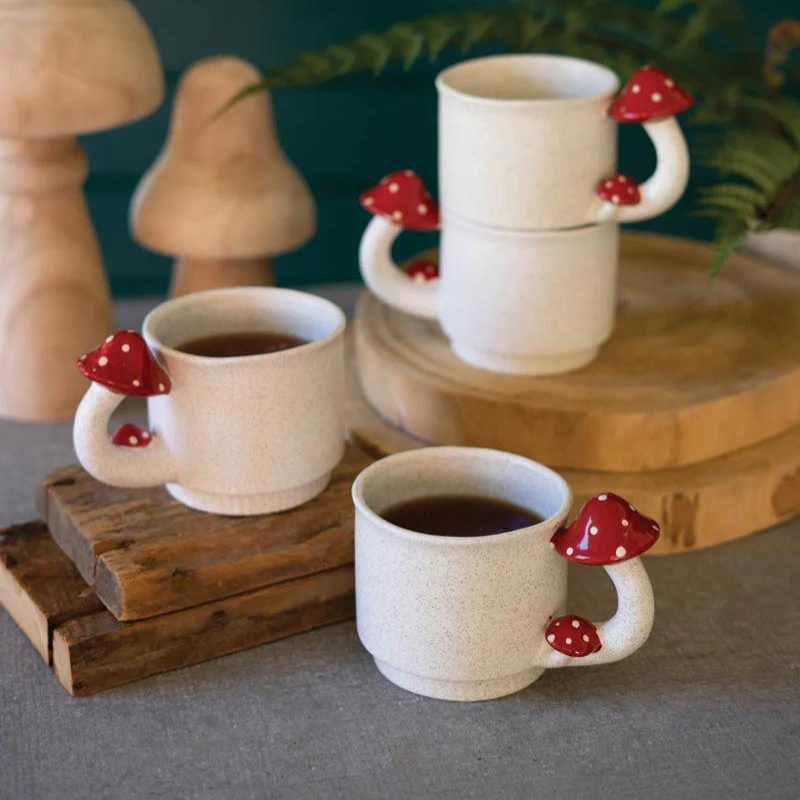 Time for tea! This darling mushroom mug brings whimsical style to coffee or tea time. The white ceramic cup has a classic red toadstool handle and easily stacks for storage or display.