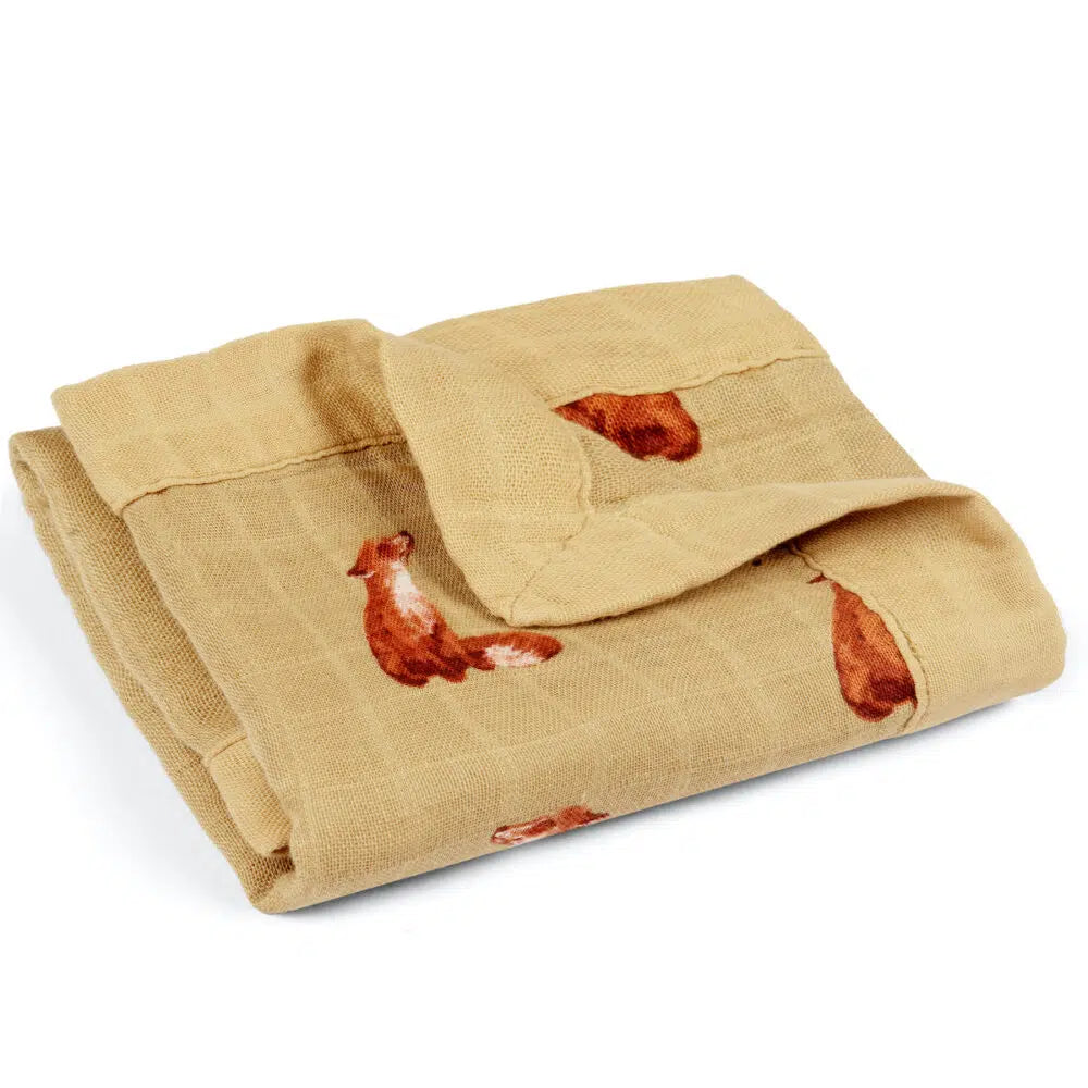 From security and comfort to reassurance and love, we understand the significance a mini lovey security blanket plays in our little one's world. The cheery olive green muslin fabric has an all-over pattern of cute little foxes sniffing at buzzing little bees!