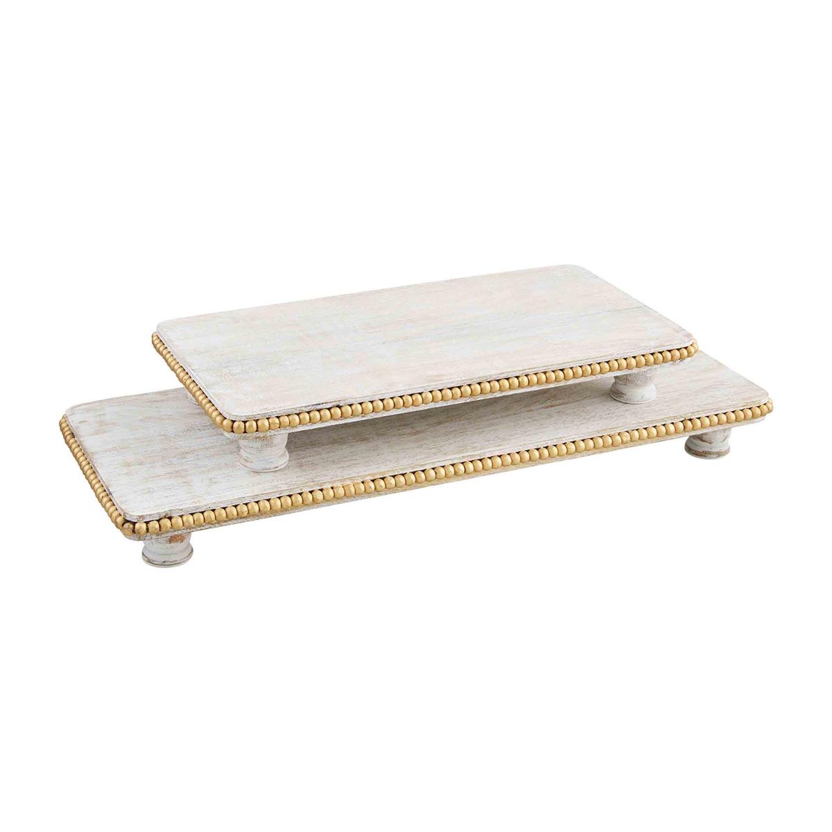 Bring a touch of sophistication to your table or countertop with this lovely wooden riser. The slightly distressed white finish is accented with gold wooden beads around the perimeter giving the riser an elegant nature. This versatile piece is great for serving your latest creations to family and friends or as a base for seasonal centerpiece.