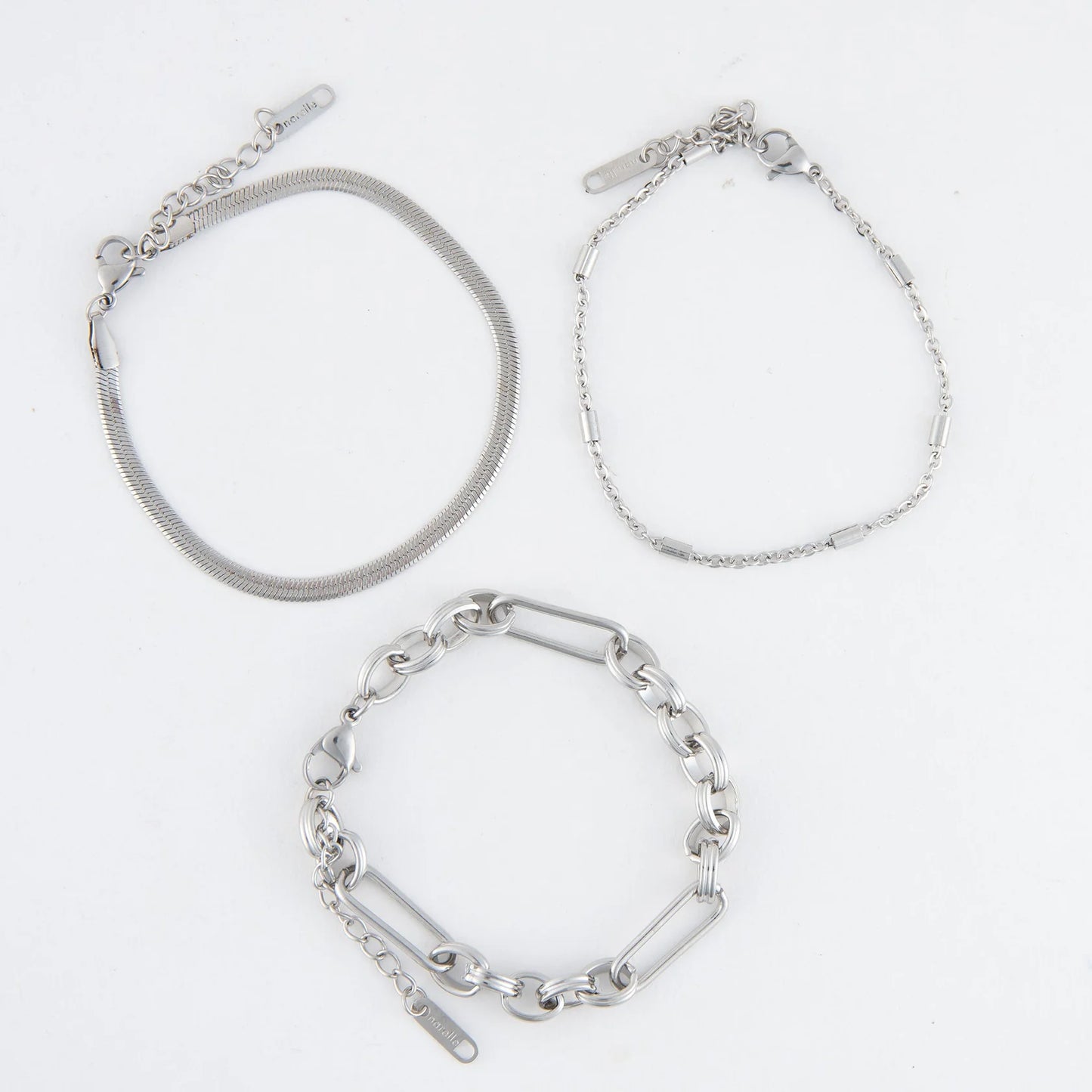 A modern take on classic designs! The Narelle Waterproof Snake Chain Bracelet Set offers three silver bracelets in trendy Paper Clip, Snake, and Dainty Chain designs. Wear them together as part of a stack, or on their own for a delicate, minimalist look. The styling options are endless!
