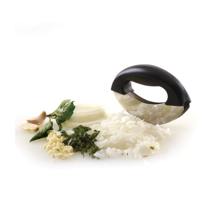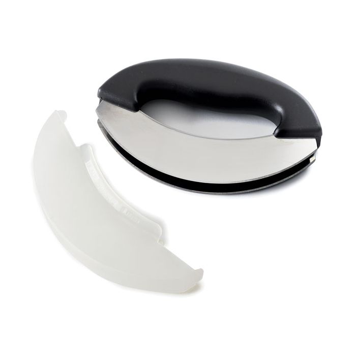 Effortlessly mince garlic, onion, herbs, nuts, and more. This mezzaluna is made of durable, heavy duty stainless steel, features beveled edges, and is ideal for chopping with one hand. Includes a cover to protect your blade and safely store the chopper.