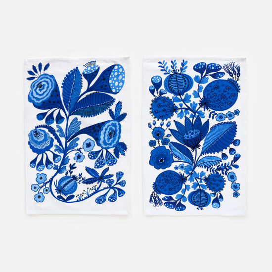 Bring vibrant color and classic style to your kitchen or bath with this beautiful blue and white towel. Inspired by classic botanical patterns, the intricate design showcases delicate florals intertwined with rich pomegranates, and embroidered accents.