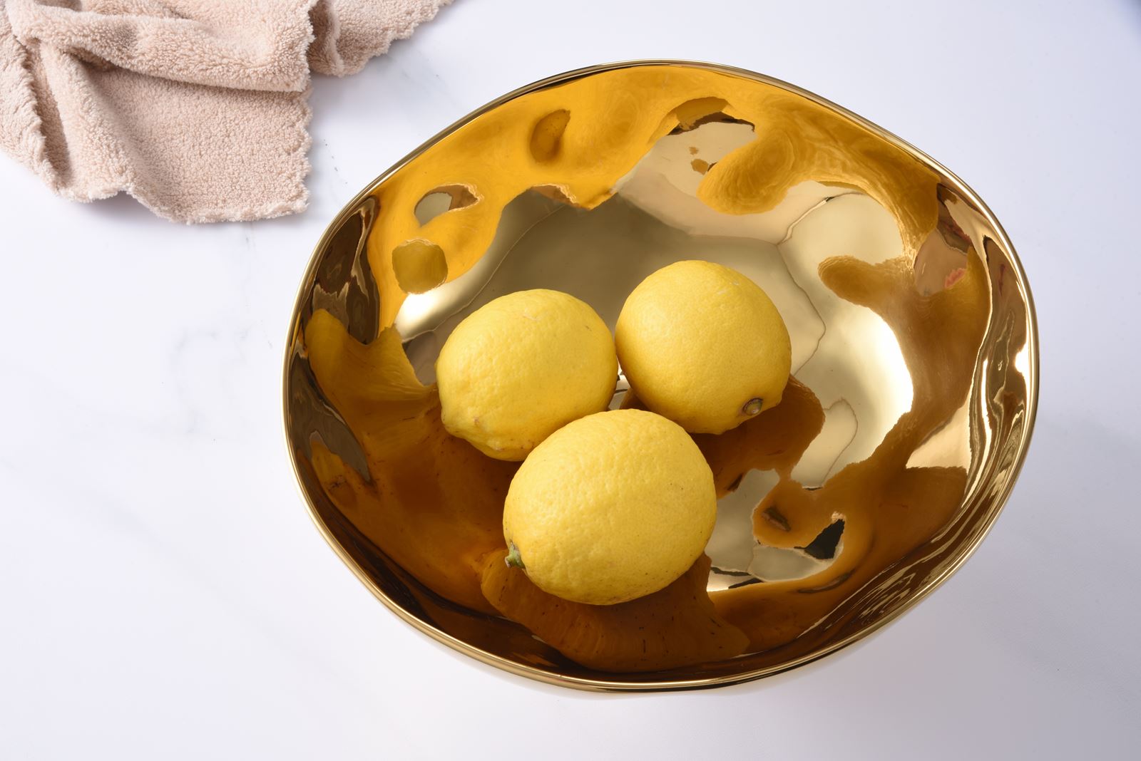 Perfect for presenting fruits and vegetables or to use as a centerpiece. Striking and elegant gold-tone titanium finished high-fired porcelain.