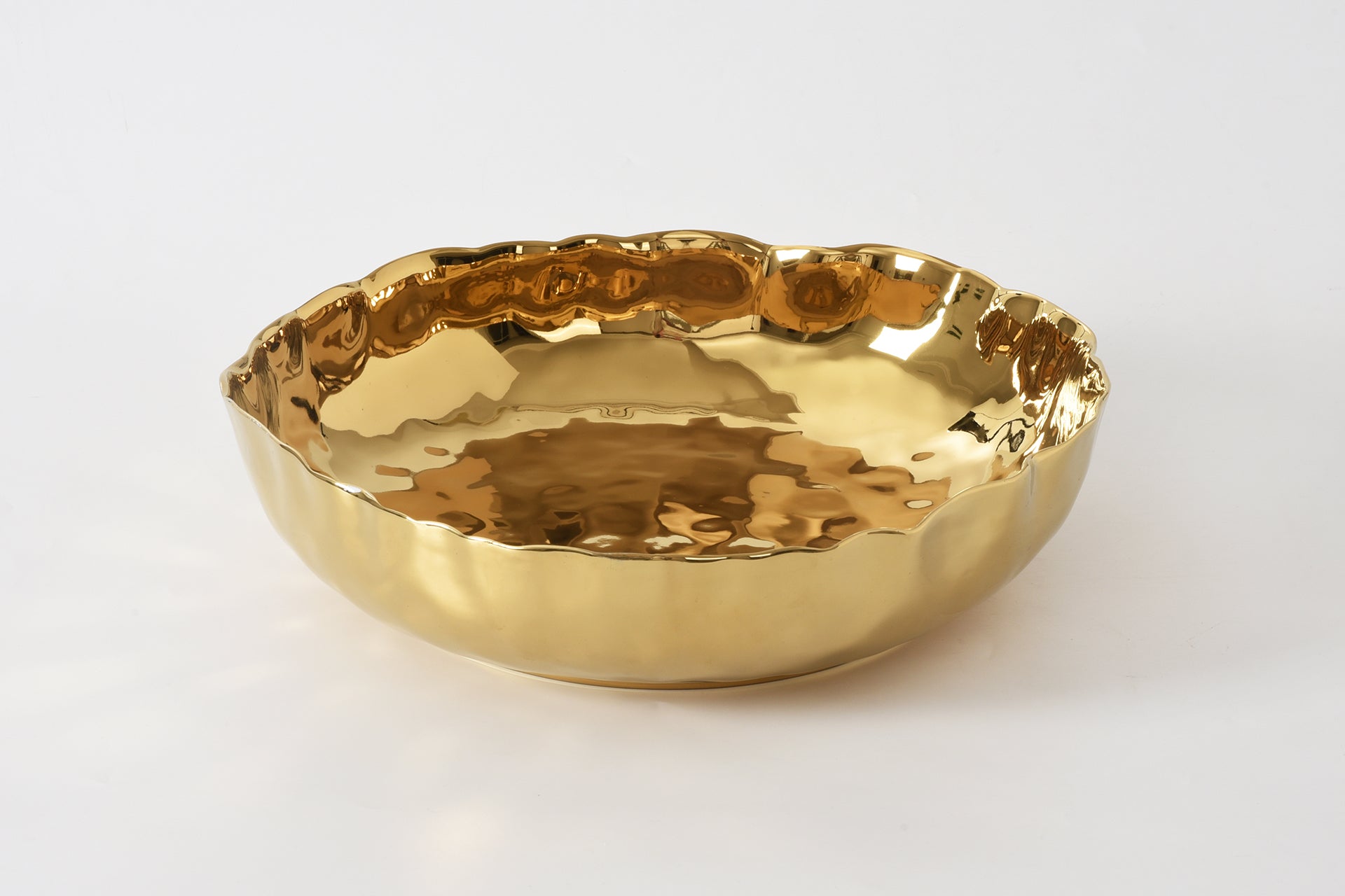 A simple and elegant serving piece for crowd pleasing dishes like paella, chicken piccata, and fettuccini alfredo. A perfect countertop piece to display fresh fruits or vegetables! Striking and elegant gold-tone finished high-fired porcelain.