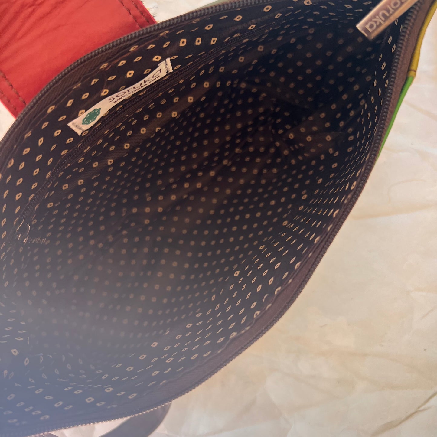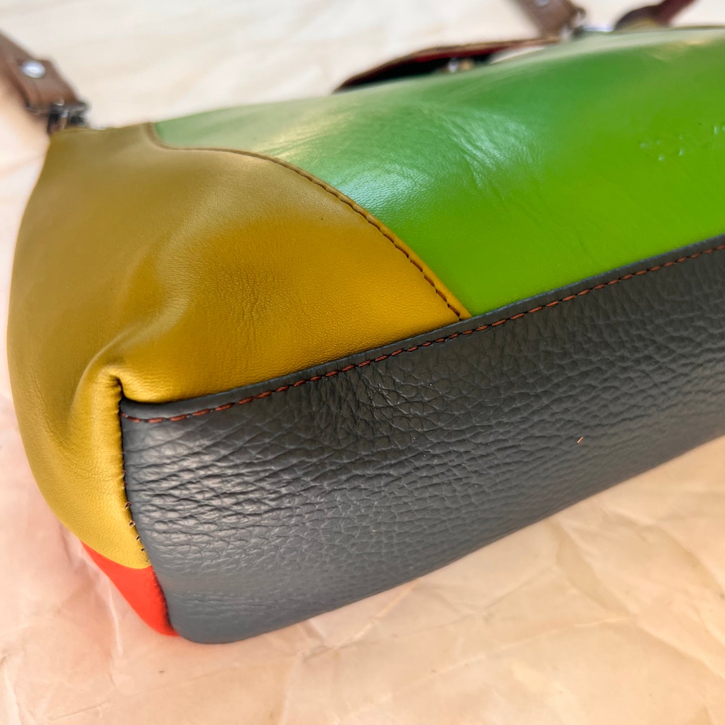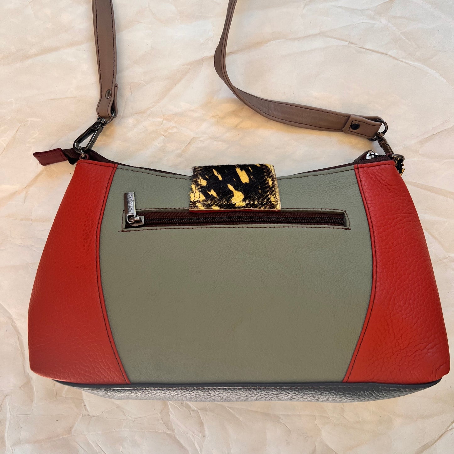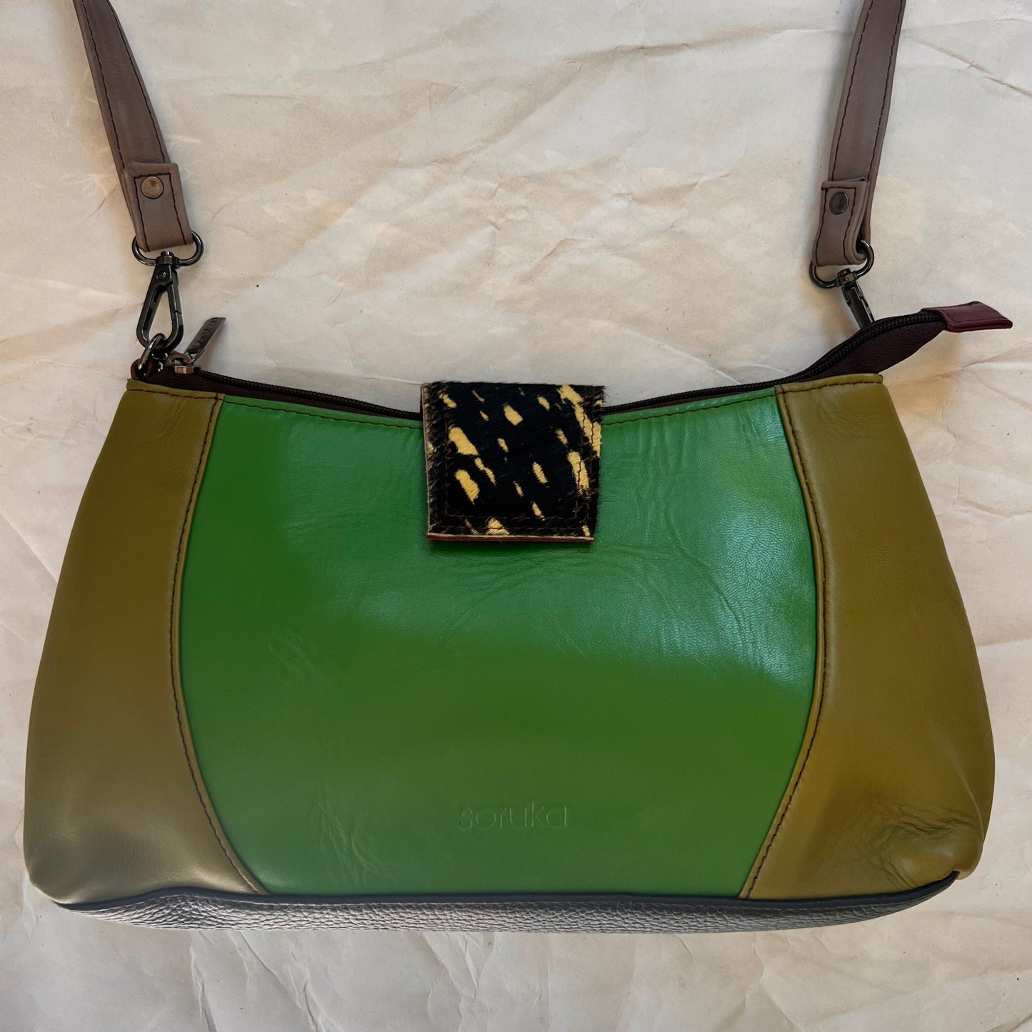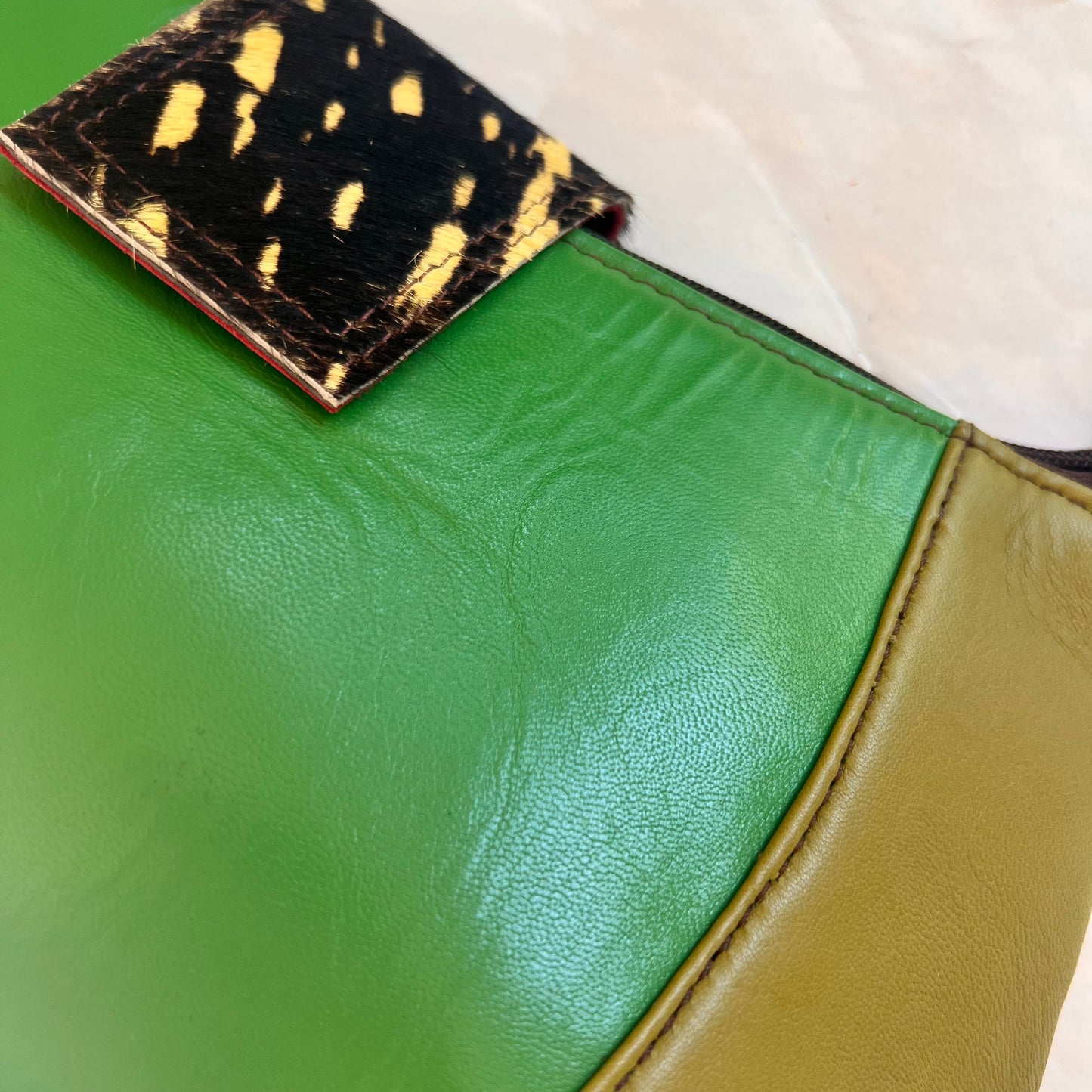 The beautiful color blocks of Kelly and olive greens on the front and blue and orange on the back make a stunning statement. The hair-on-hide animal print flap adds extra security while on the go.