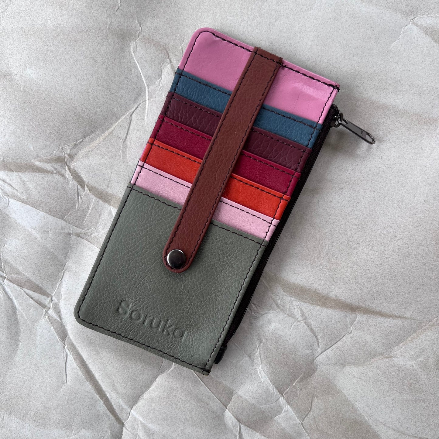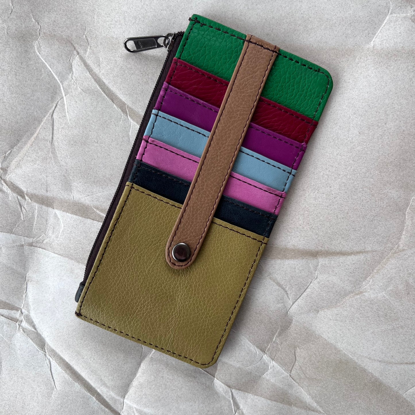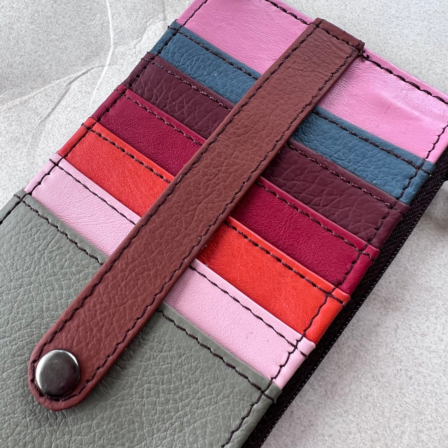This handy card holder is full of form, function, and color! The streamline design makes it easy to slip into any bag for a quick change with any style. With six slots on each side there is plenty of space for cards, cash, and notes or receipts and the snap tabs keep everything secure. A zippered pocket on the top is great for change, lippie, and other small items.