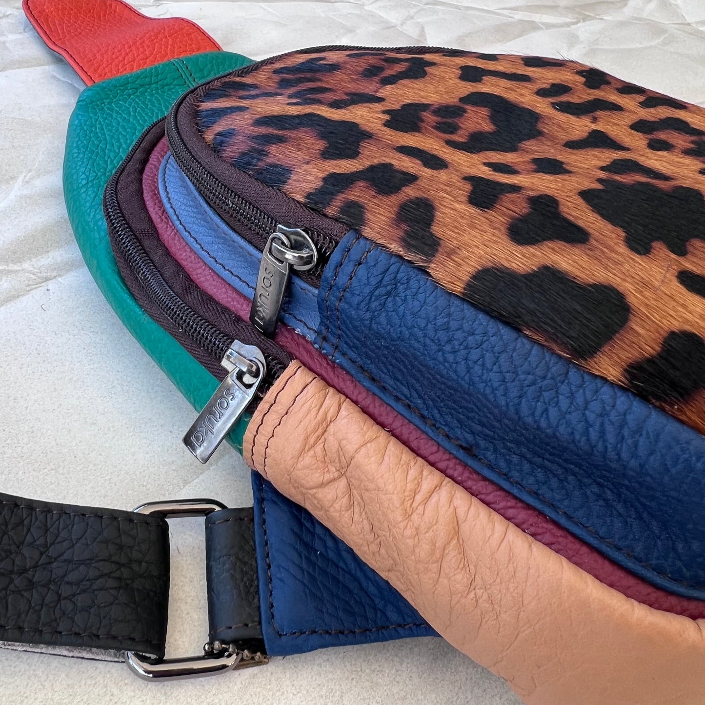 This super cool bag is perfect for work, school, and everyday life; getting you where you're going in style. Made from leathers in an array of colors with a hair-on-hide cheetah print front pocket, a pale, mossy green back, and grey strap, it has an easy going look for any occasion.