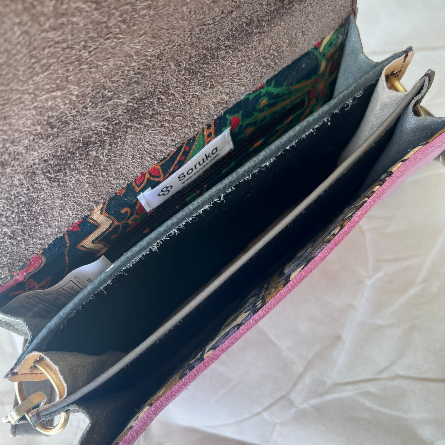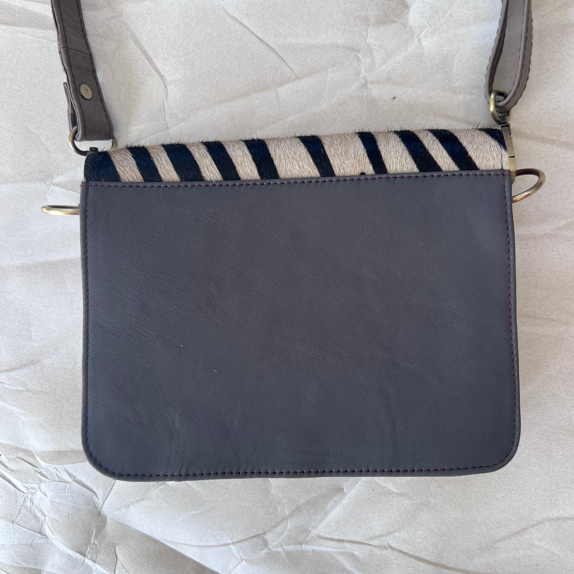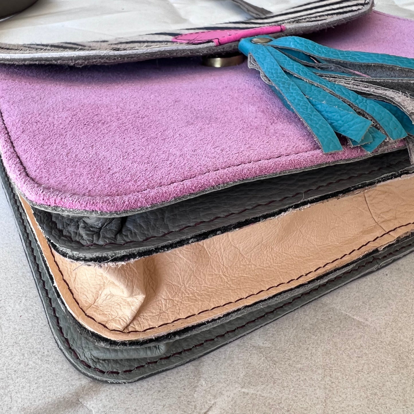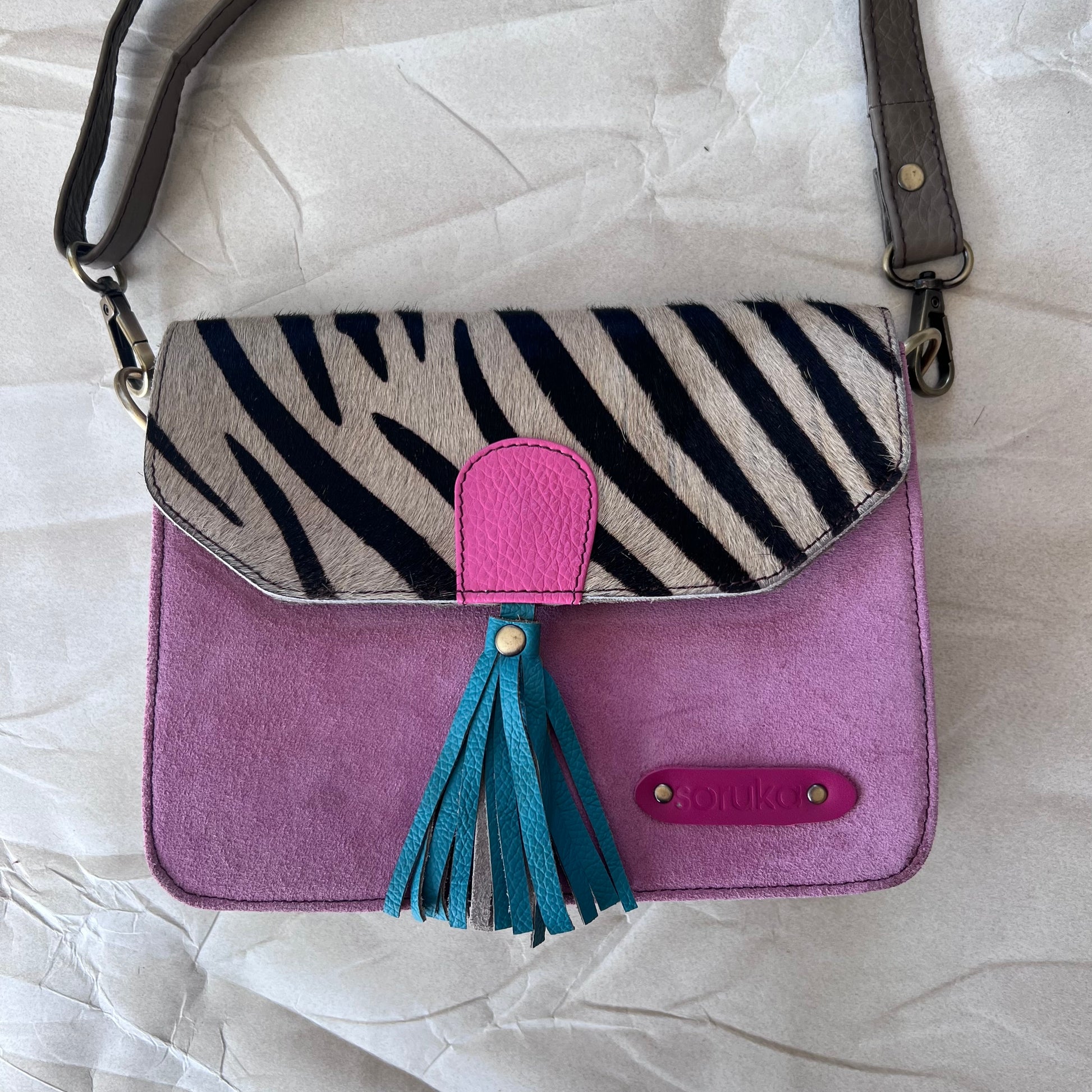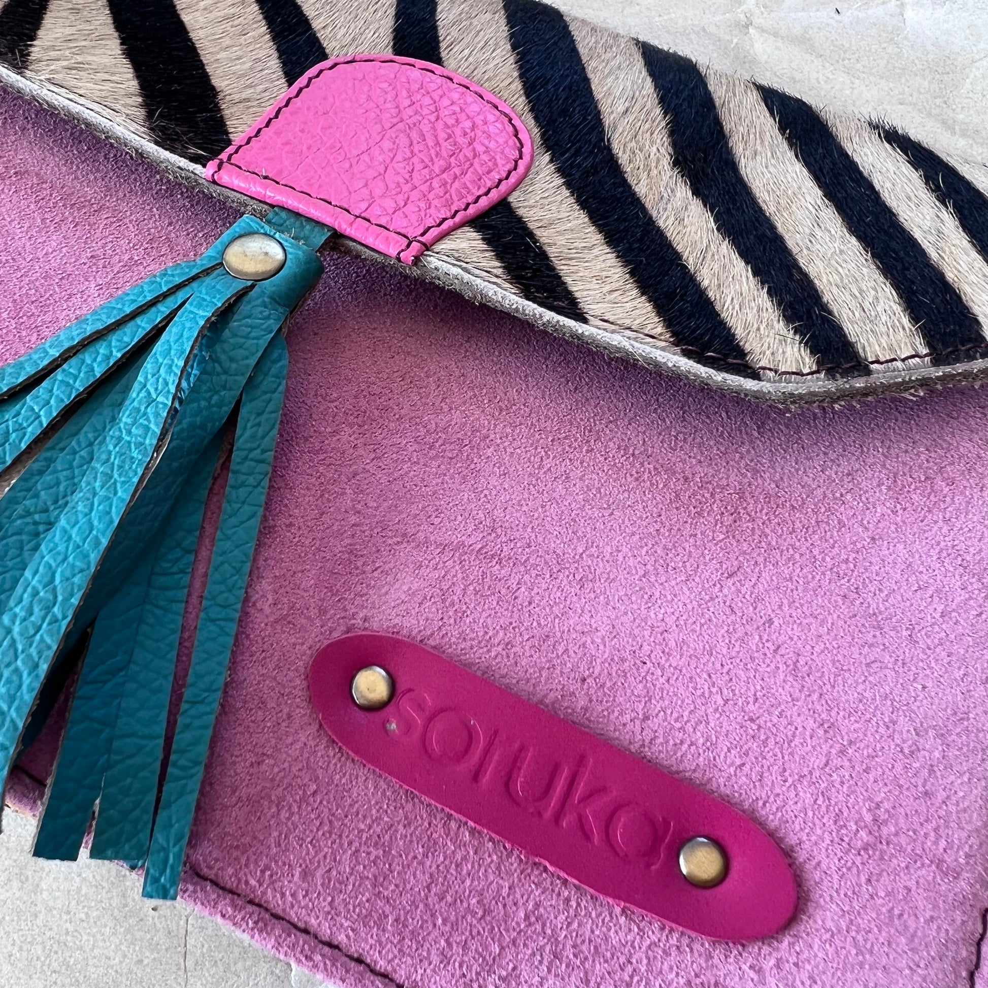 Claire is a playful bag full of personality! It is made from a mix of suede and leather with a hair-on-hide animal print flap that has a magnetic closure. The front of the bag is dusty pink and the back is warm brown. The black and white stripe animal print flap has a pink tab and a fun turquoise tassel.