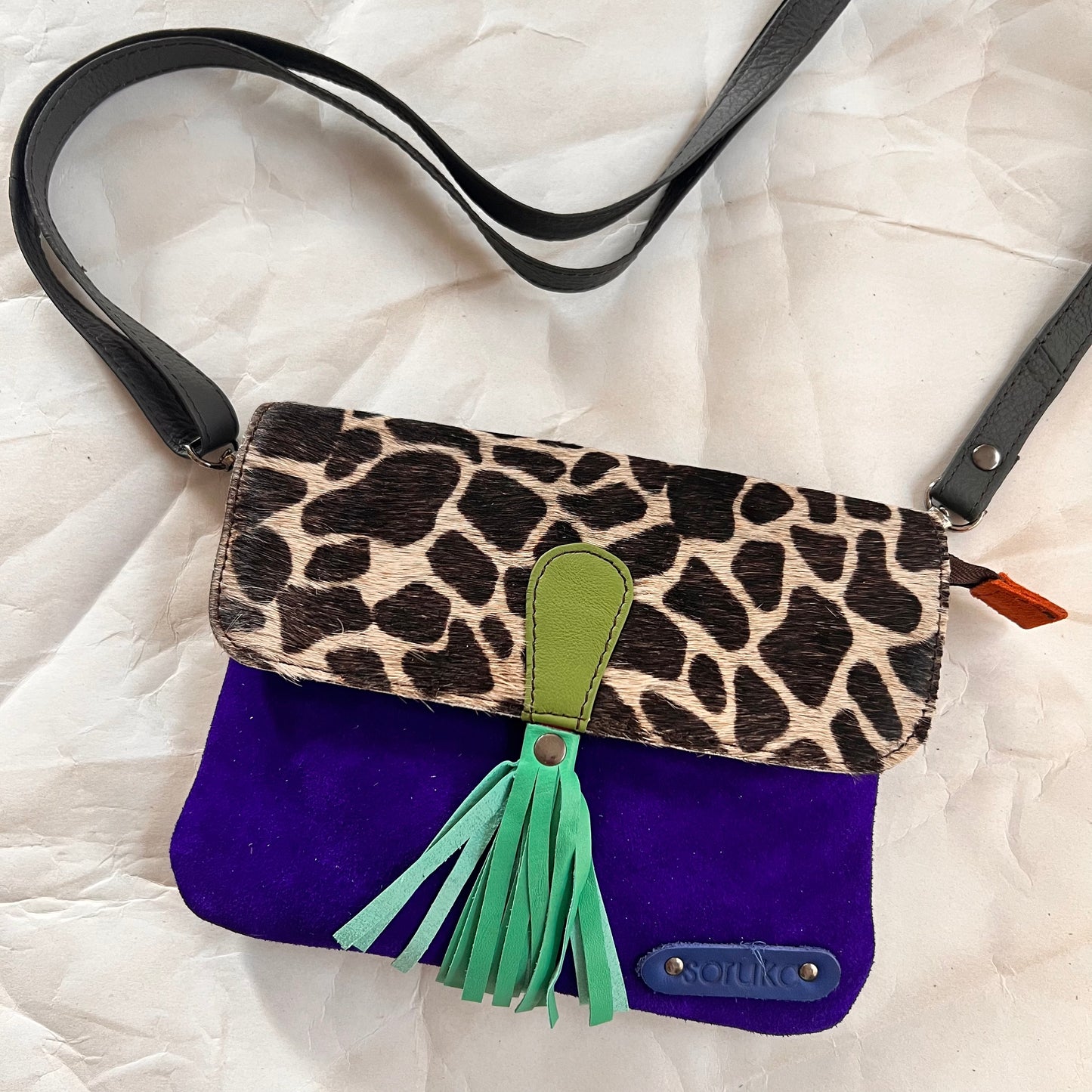 This wonderful little bag is perfect for running around town, heading to class, or going out for the evening. This beautiful suede bag has vibrant purple front and taupe back with a hair-on-hide animal print flap and a green tassel. Juliette is perfectly sized for essentials: cards, phone, keys, and lippie - and you're ready to go!