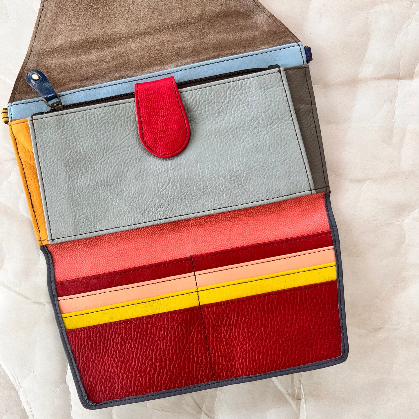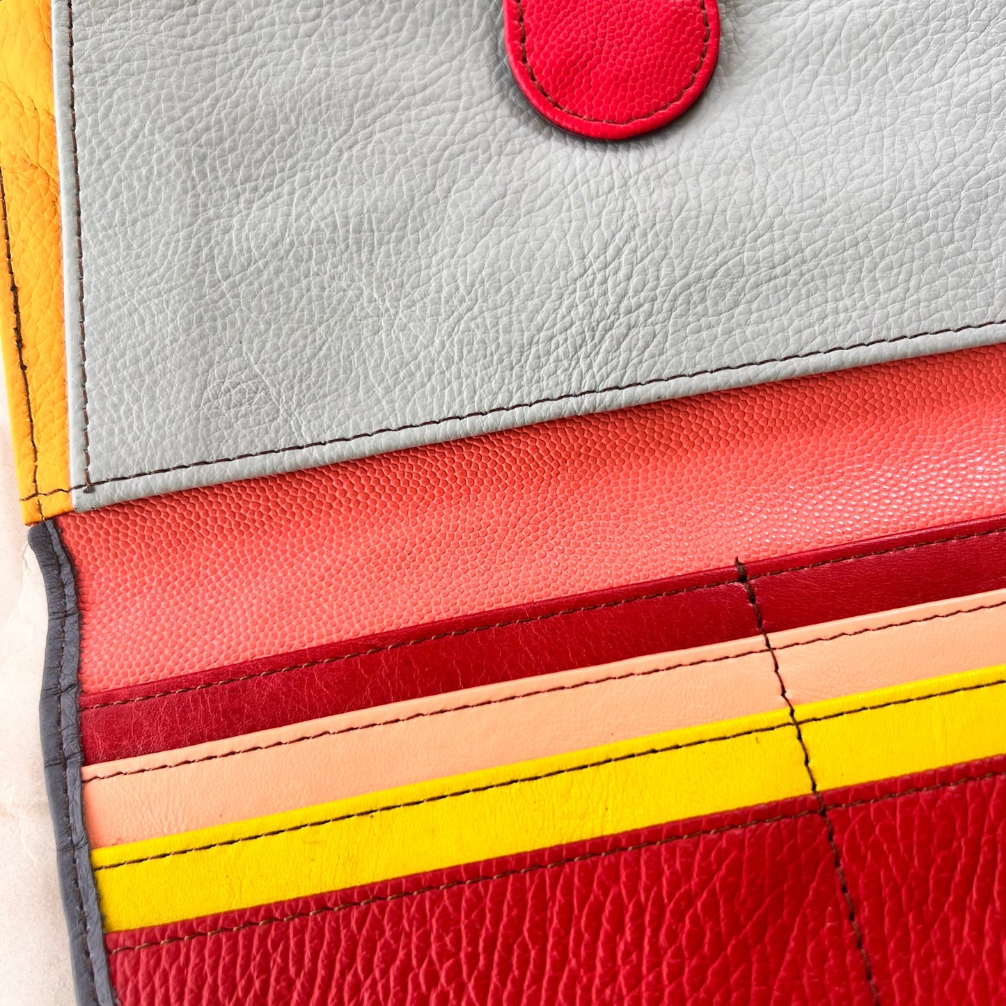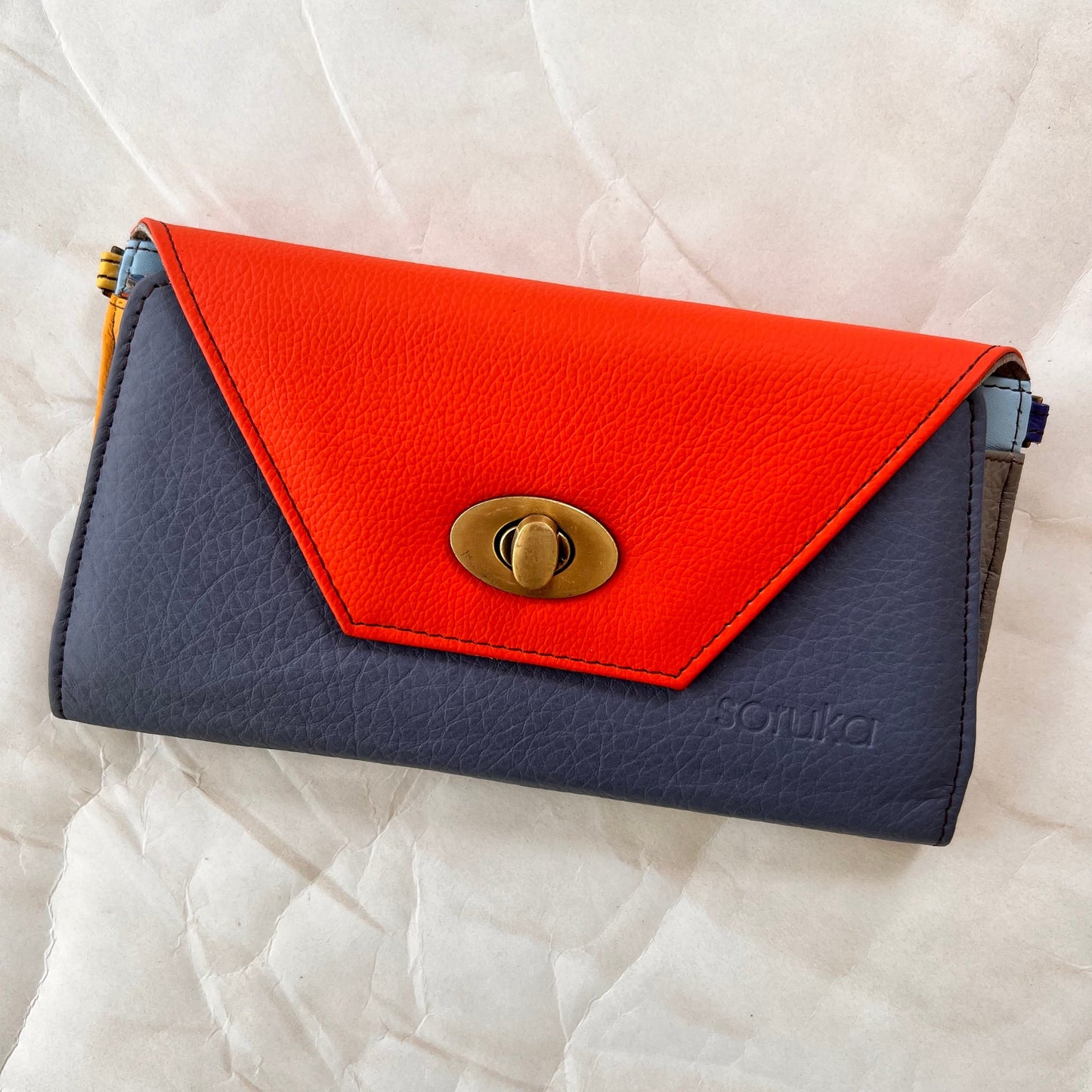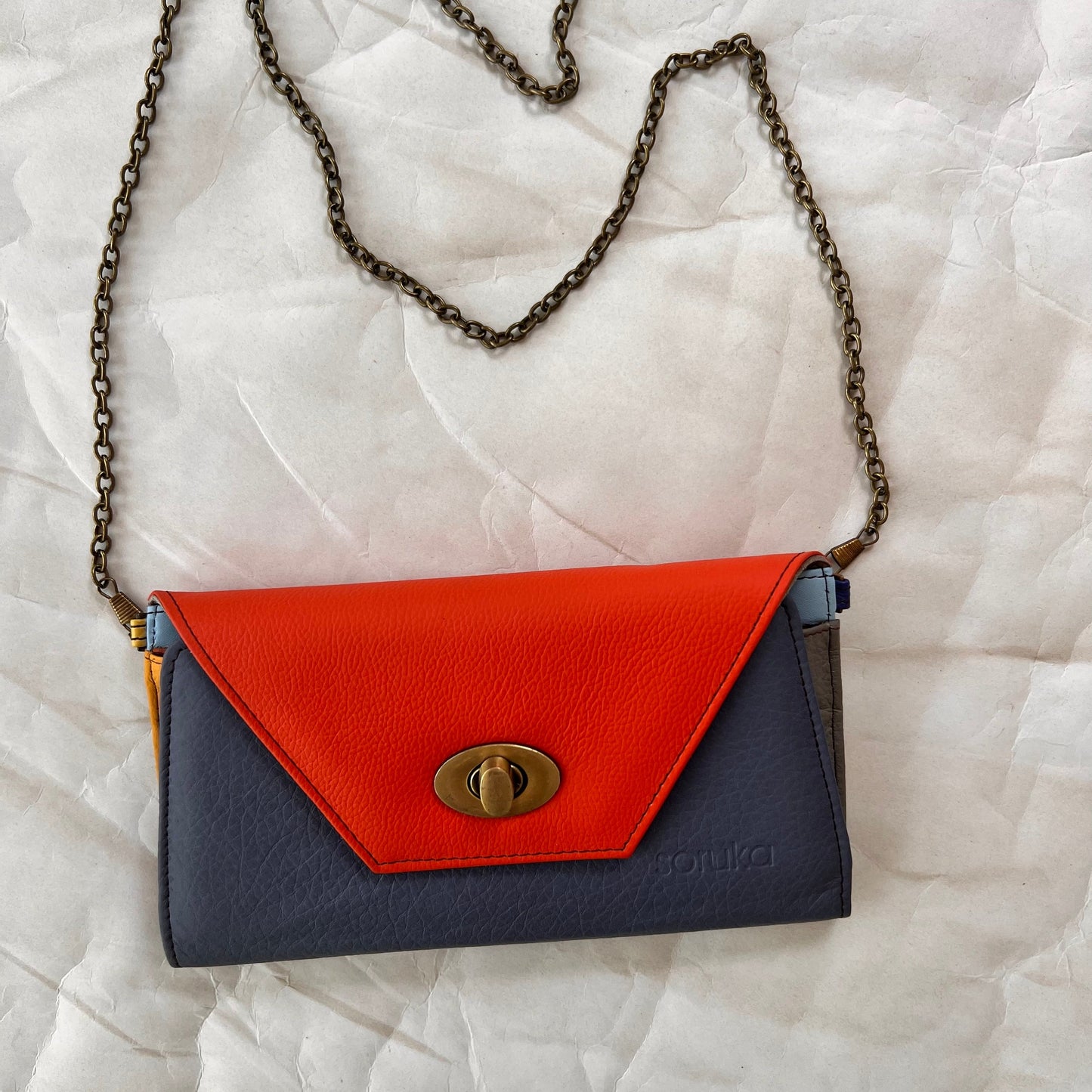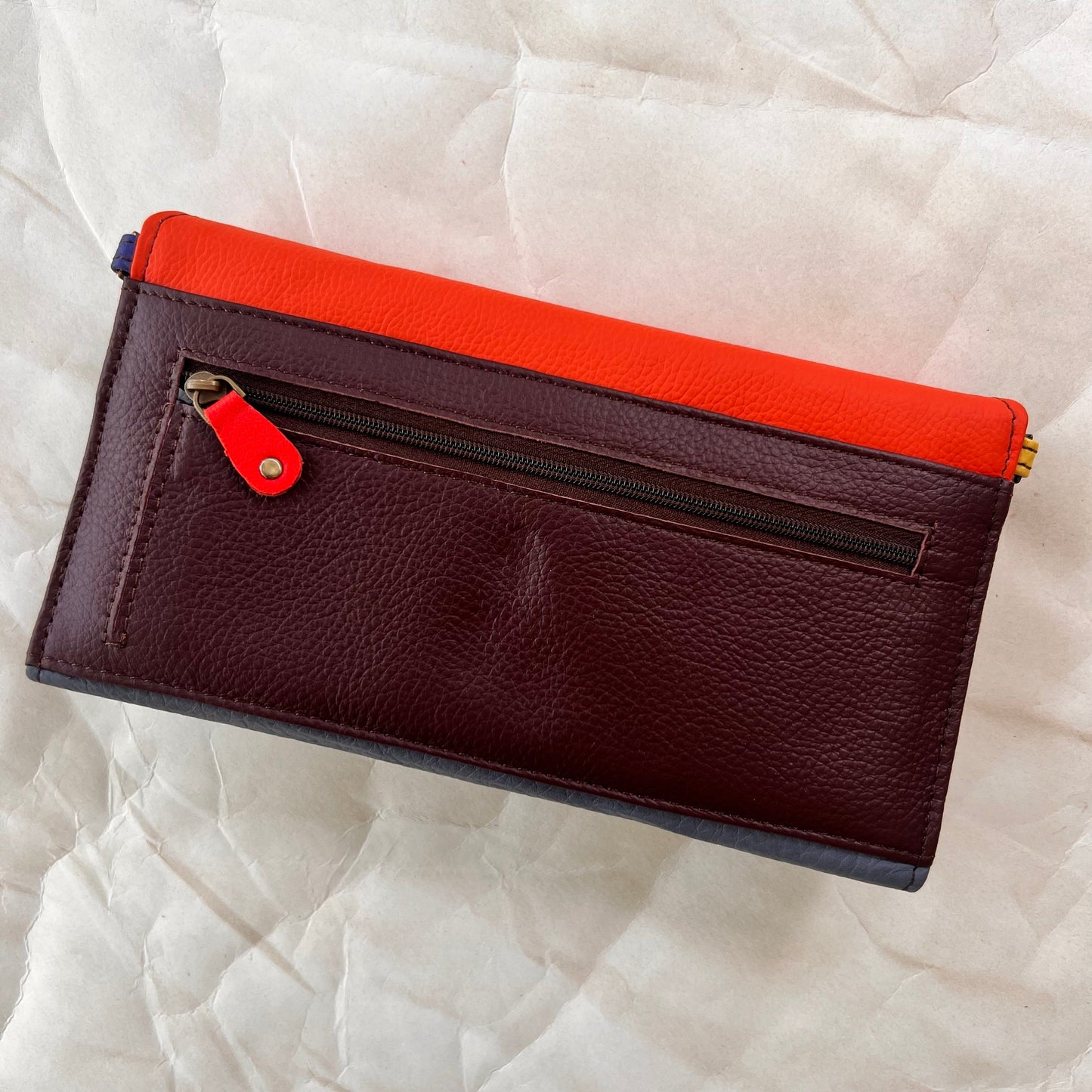 This fantastic clutch doubles as a wallet with a removable chain handle. The tri-fold design has an exterior zipper pocket on the back and twist clasp on the front. The interior features two larger pockets, a zipper pocket, and colorful card slots.