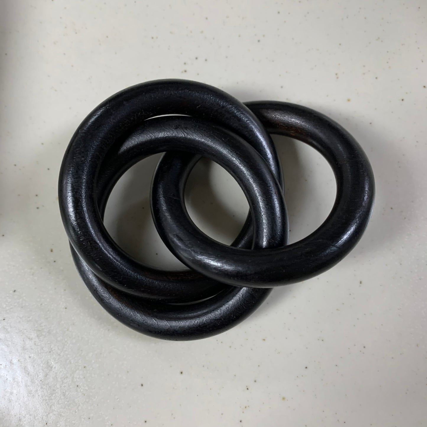 Three rounded rings of black beechwood are intertwined to create this table-enhancing napkin ring. Interlocking rings bring the appeal of a trio of bangles to a place setting and adds to a modern, minimalist, or farmhouse table.