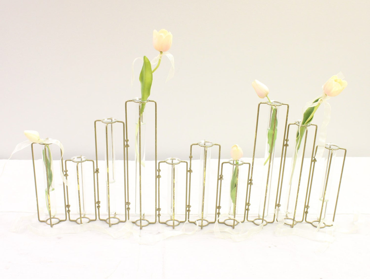 Dainty glass test tubes hang in a hinged wire frame making it easy to shape to fit your needs. Whether it is along the center of a table or across the mantle, or curved around other decor pieces, it brings effortless charm to any space.